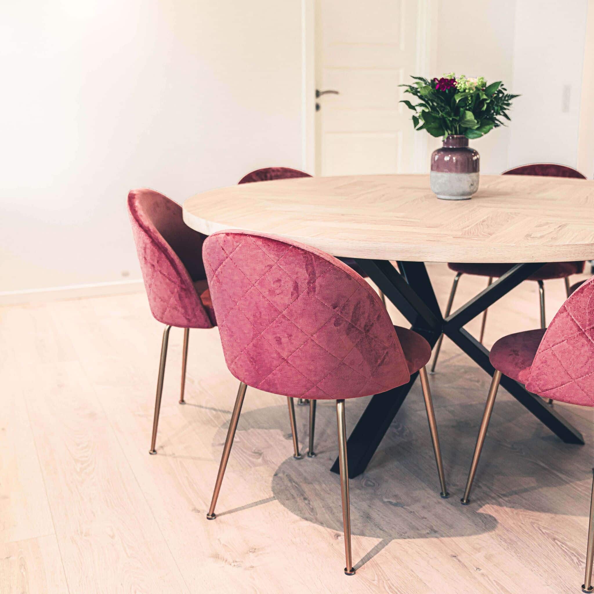 Freja Sildebensbord i lys eg changerer fantastisk smukt, med lyse toner, som smelter sammen så sildebensmønstret kommer fint, let og elegant til udtryk. Spisebordet i rundt kan bestå af én hel plade eller af 2 halvmåner med mulighed for udtræk og tillægsplader.