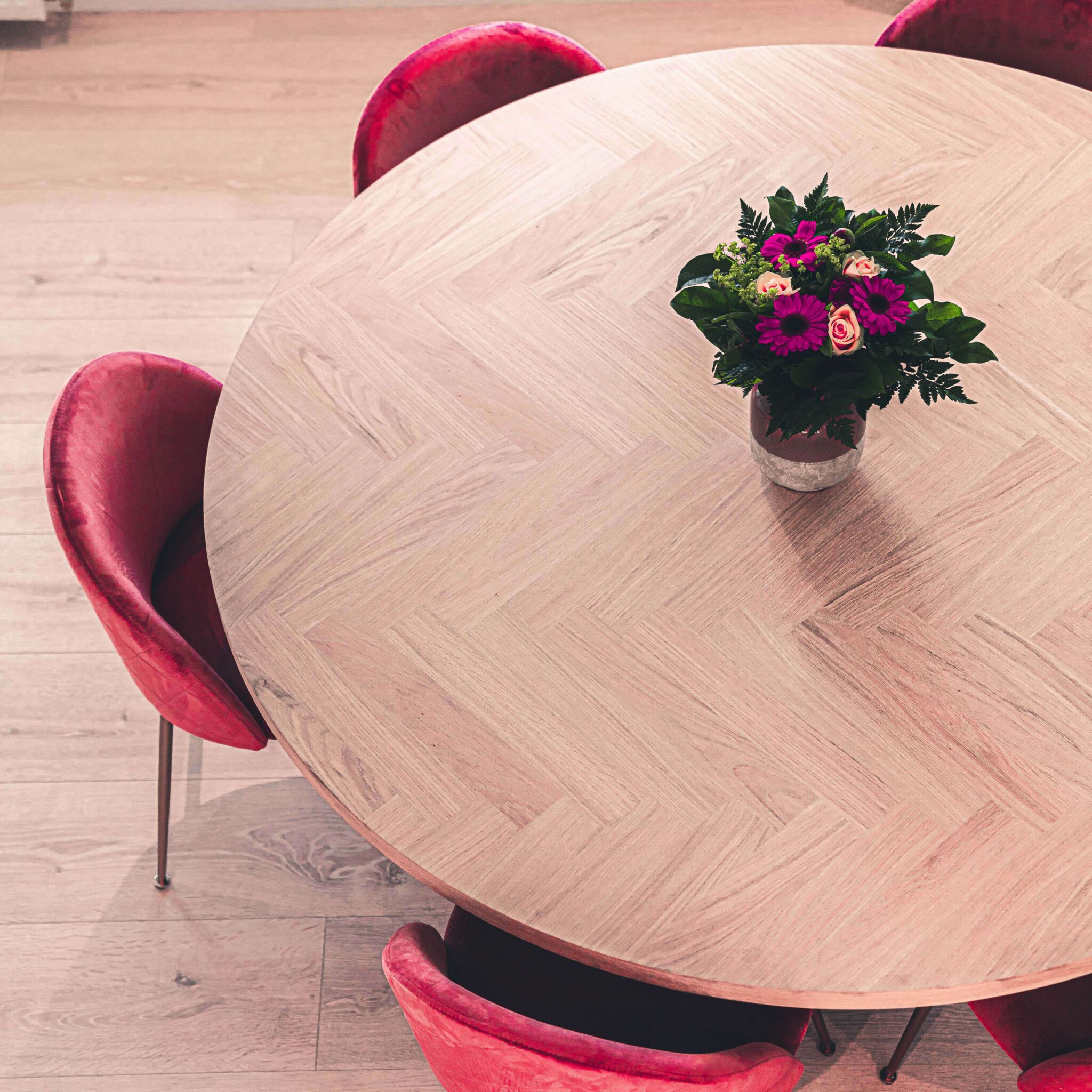 Forside Shop Spiseborde Runde spiseborde Rundt spisebord med udtræk Freja – Rundt sildebensbord i lys eg